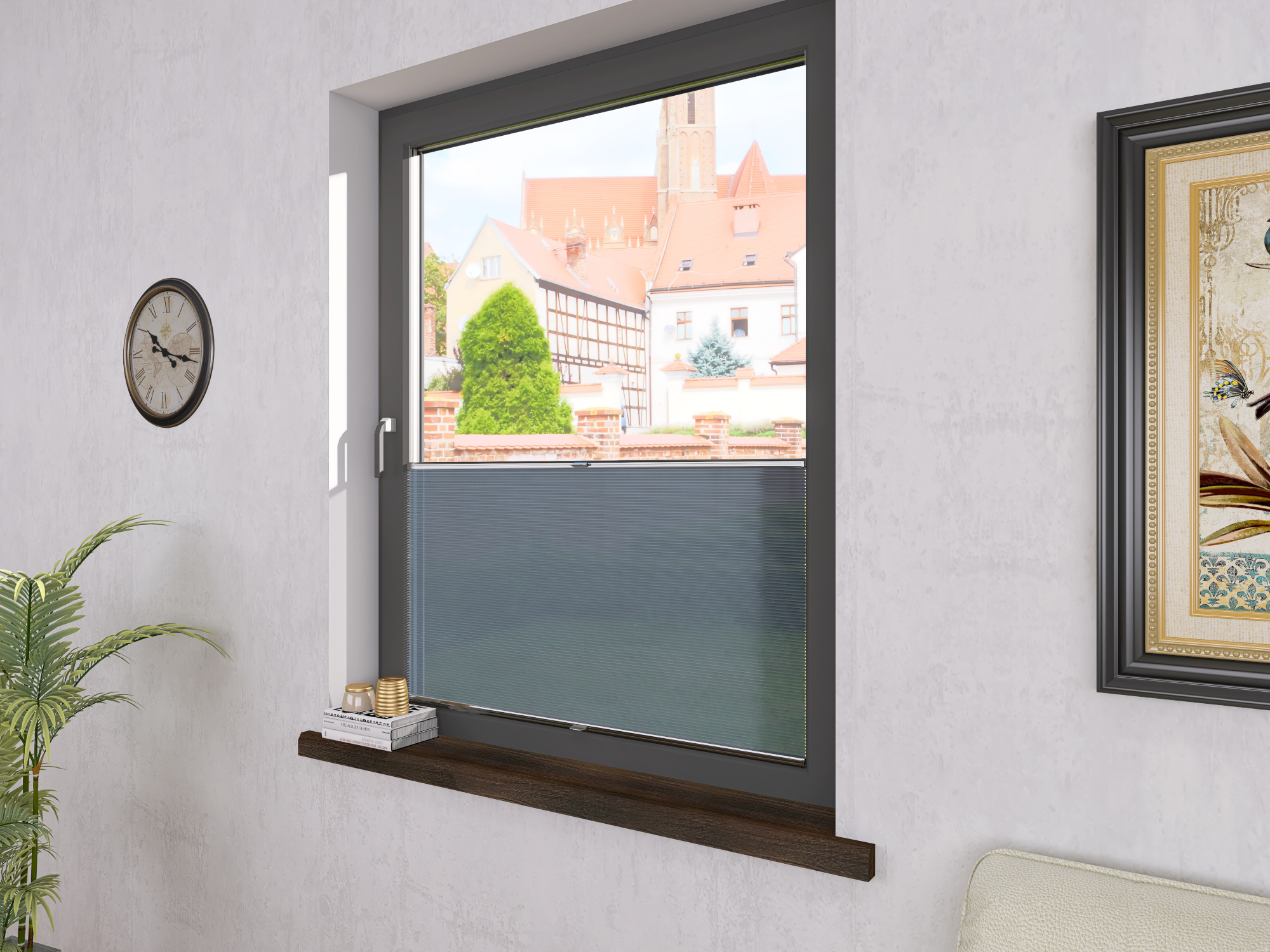DIEGO – lekka tkanina poliestrowa (153 g/m²) o trwałych kolorach i przepuszczalności światła 28–48%. Plisowane lamelki (20 mm) nadają jej wyjątkowy wygląd, a delikatna grubość 0,4 mm sprawia, że jest subtelna i elegancka.