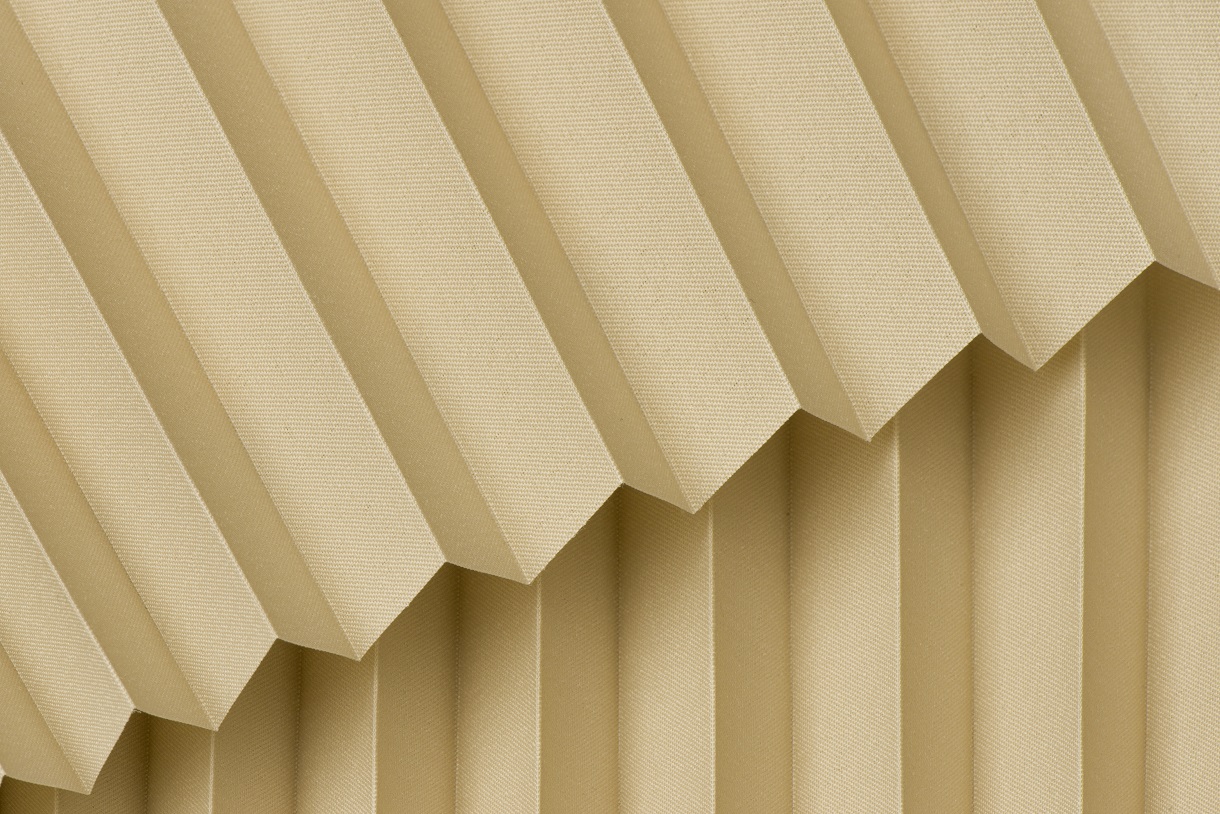 DIEGO – lekka tkanina poliestrowa (153 g/m²) o trwałych kolorach i przepuszczalności światła 28–48%. Plisowane lamelki (20 mm) nadają jej wyjątkowy wygląd, a delikatna grubość 0,4 mm sprawia, że jest subtelna i elegancka.