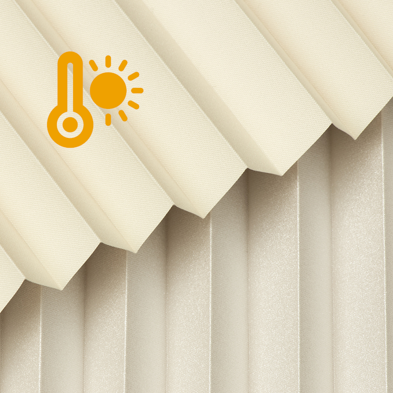 DIEGO PEARL – tkanina z powłoką odbijającą światło, gramatura 167 g/m². Transmisja światła od 0,30% do 15,62% w zależności od koloru. Eleganckie plisy (20 mm) i delikatna struktura (0,4 mm) gwarantują stylowy wygląd i wysoki komfort.