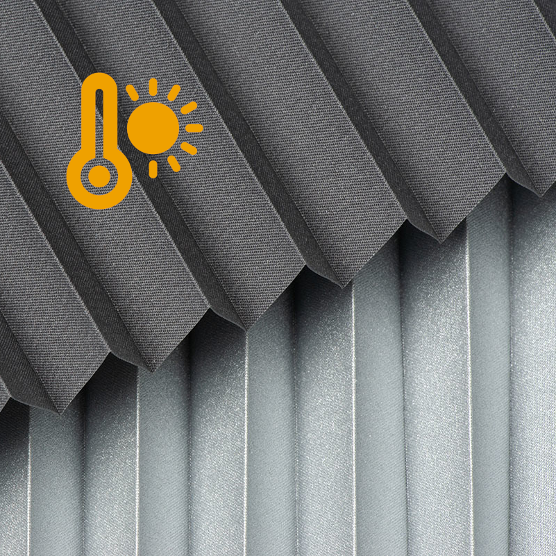 DIEGO PEARL – tkanina z powłoką odbijającą światło, gramatura 167 g/m². Transmisja światła od 0,30% do 15,62% w zależności od koloru. Eleganckie plisy (20 mm) i delikatna struktura (0,4 mm) gwarantują stylowy wygląd i wysoki komfort.