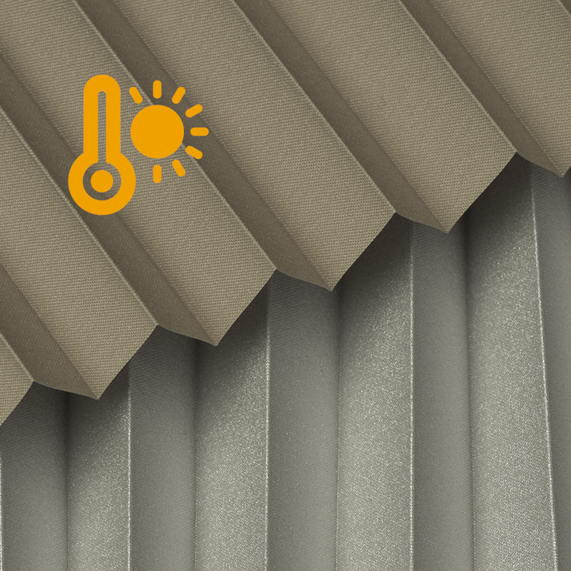 DIEGO PEARL – tkanina z powłoką odbijającą światło, gramatura 167 g/m². Transmisja światła od 0,30% do 15,62% w zależności od koloru. Eleganckie plisy (20 mm) i delikatna struktura (0,4 mm) gwarantują stylowy wygląd i wysoki komfort.