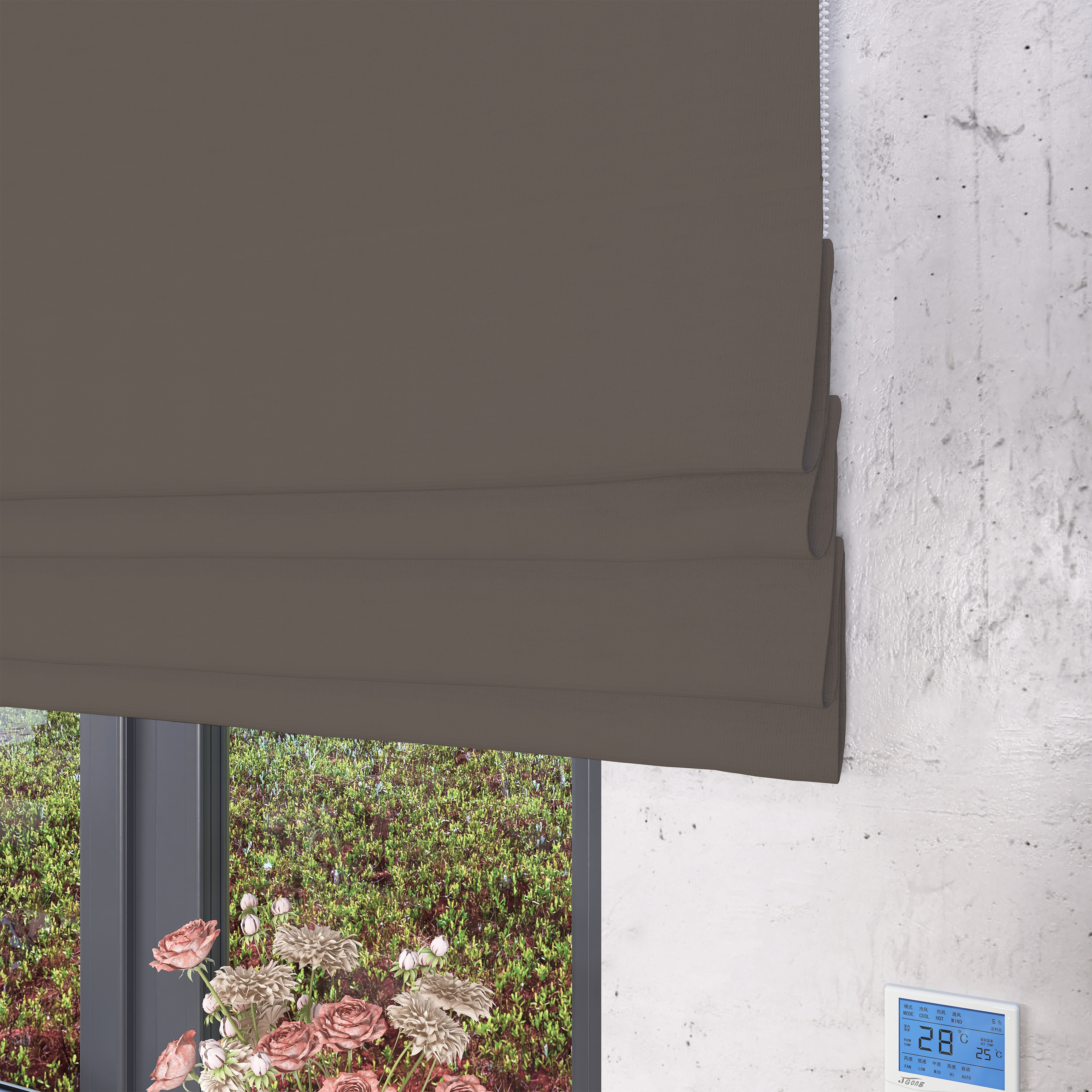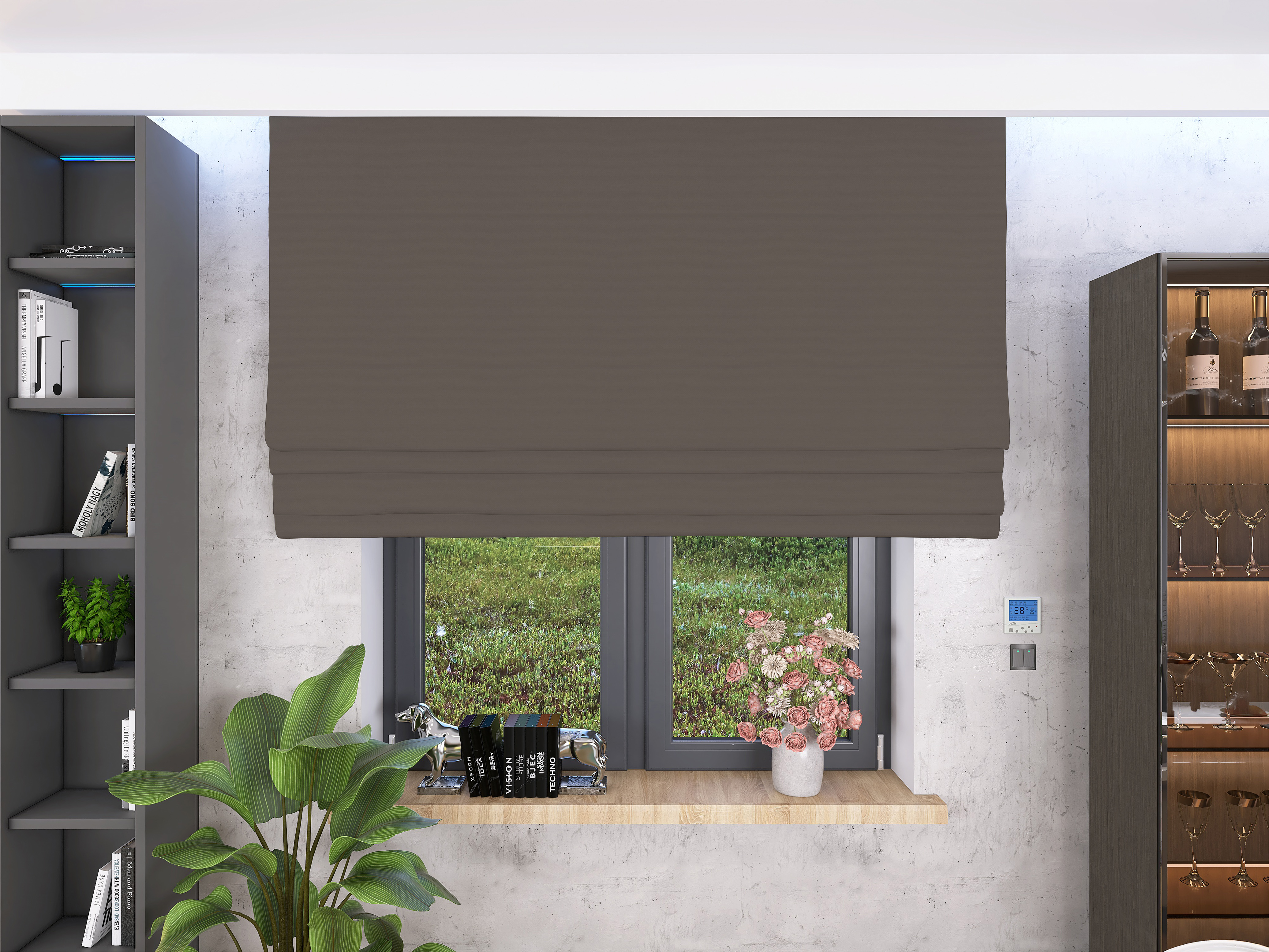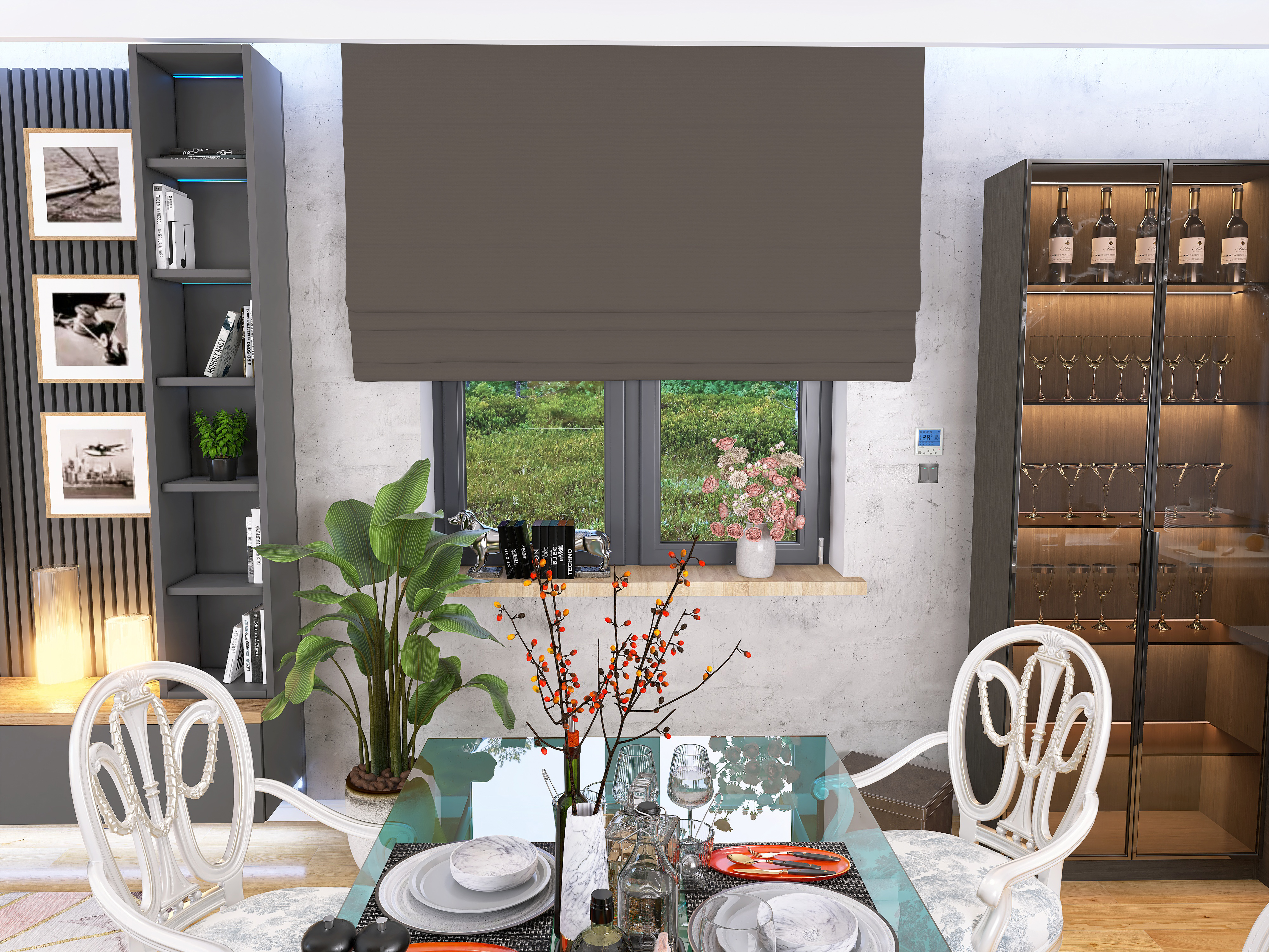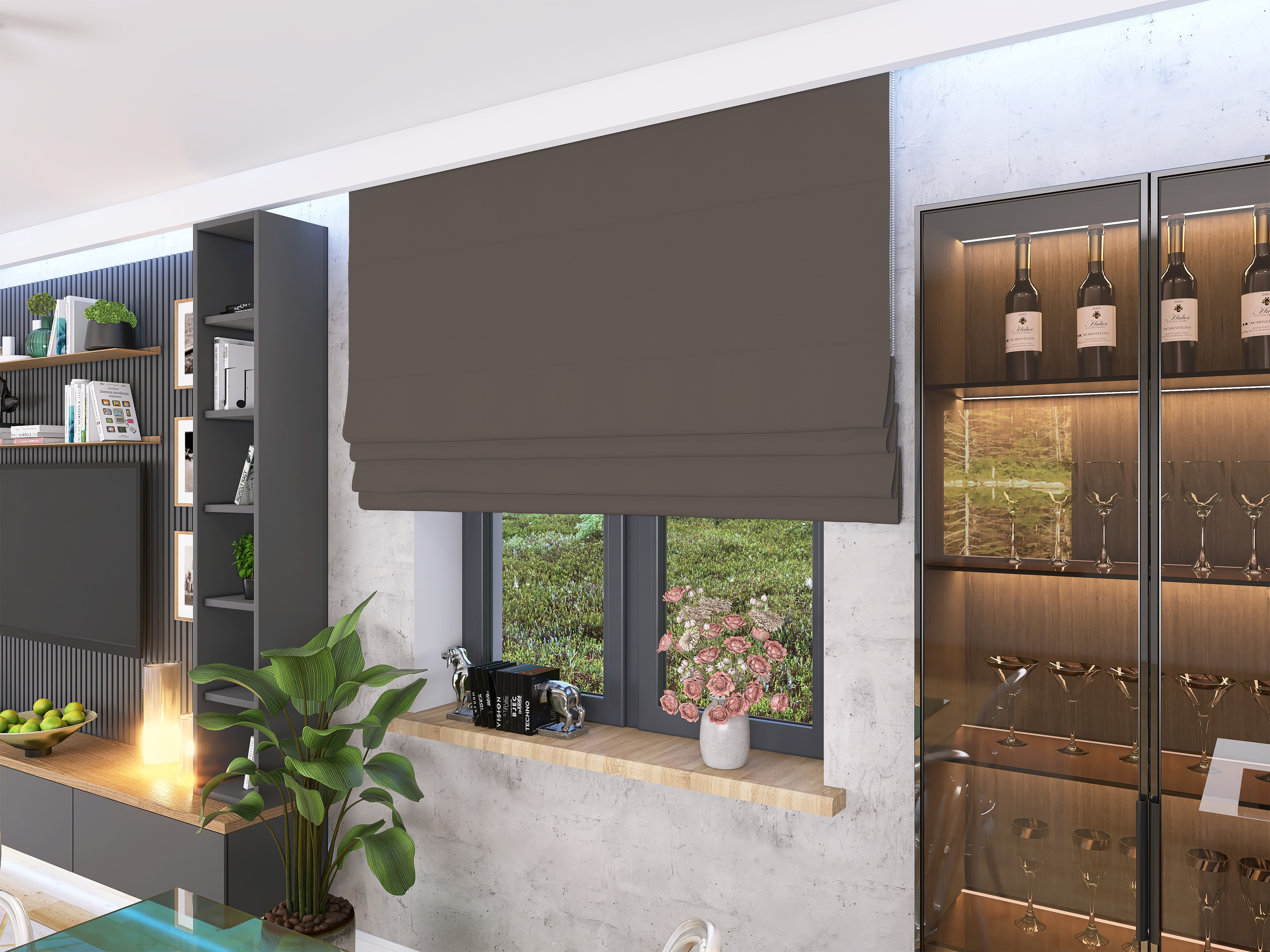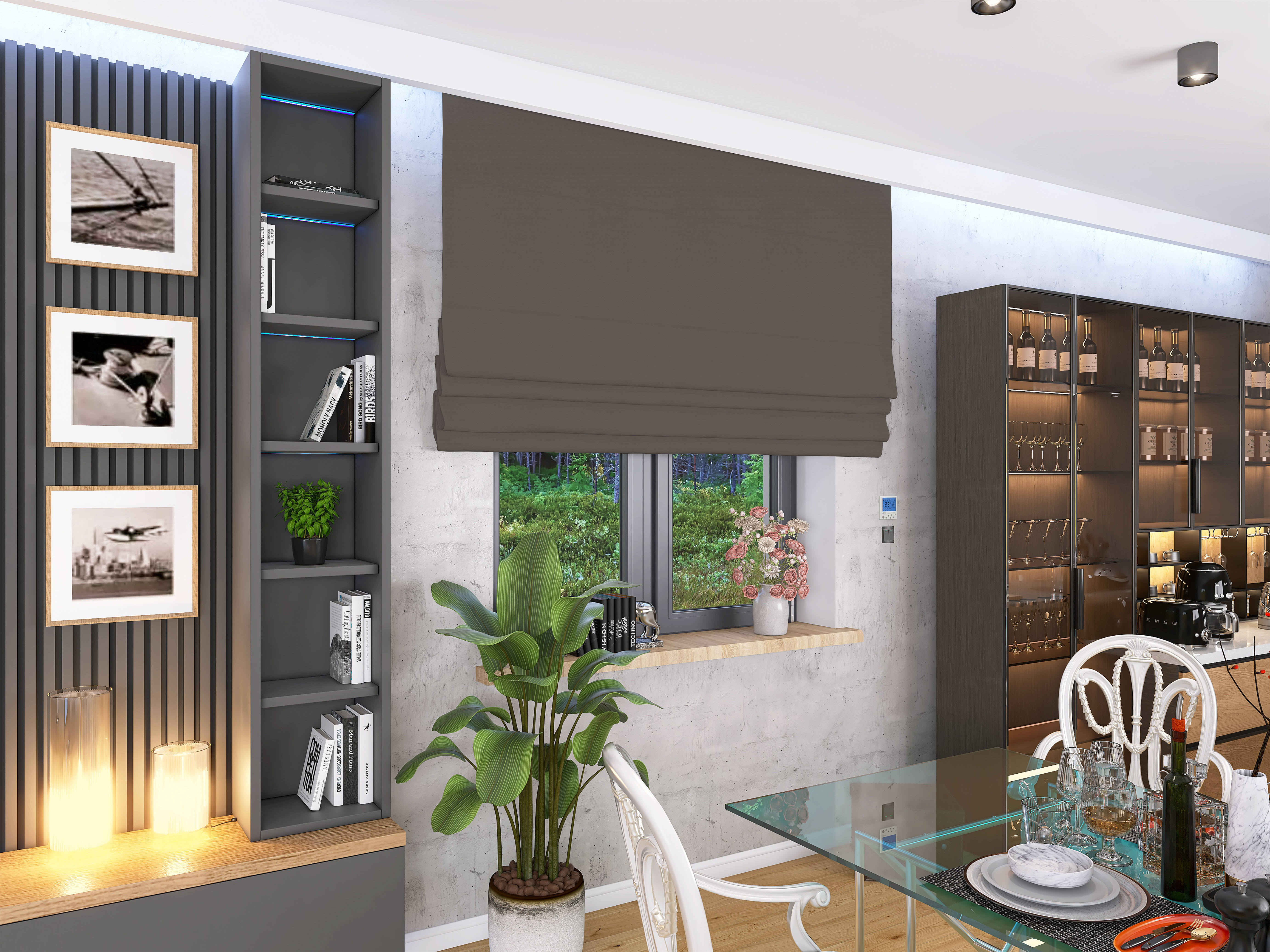 Roleta rzymska w odcieniu grafitu wyróżnia się głębią koloru, która łatwo dopasowuje się do różnorodnych stylów aranżacyjnych — od minimalistycznych loftów po bardziej eleganckie przestrzenie. Barwa grafitowa działa subtelnie, nie przytłaczając wnętrza, a jednocześnie pełni funkcję dekoracyjną, podkreślając wyraźne linie i detale otoczenia.