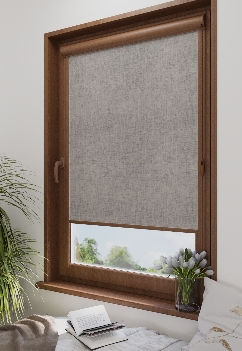 Roleta w kasecie Classic Tkanina Blackout 0014 Jasny szary melanż – kaseta orzech